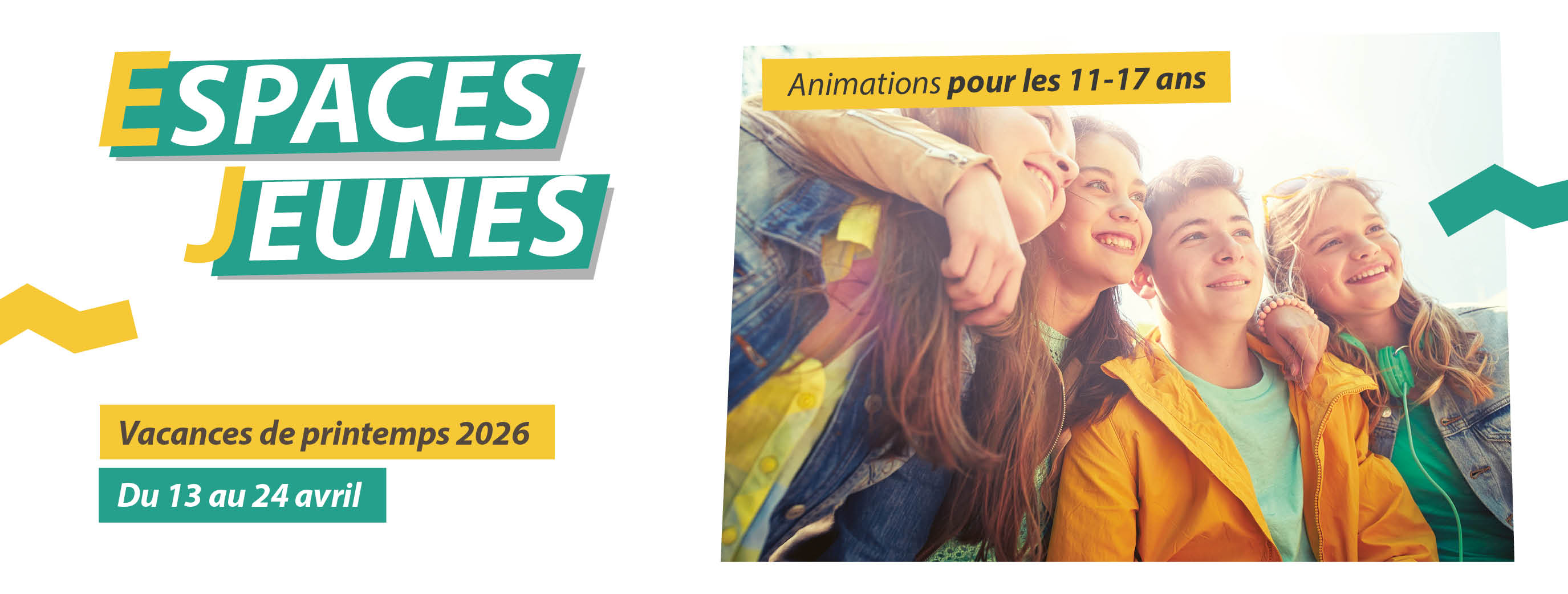 Les espaces-jeunes sont ouverts durant les vacances de printemps ! Rendez-vous dans ton espace-jeunes pour faire de nombreuses activités sur mesure : Création de cosmétiques naturels, Soirée Top Chef, Atelier doublage, Stage de pâtisserie, Accrobranche, Sortie fête foraine, Surf, Futuroscope, Goûter Healthy, Zumba tropical, Grimpe Arbre, Tournoi Gaming... et tant d'autres activités pour passer de belles vacances entre jeunes de 11 à 17 ans.